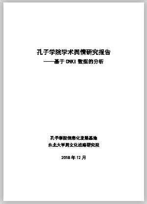 基地于2018年12月提交了一份题为《孔子学院学术舆情研究报告——基于 CNKI 数据的分析 》的资政报告。该报告对2004年以来CNKI的全部文献数据进行了统计分析,描述了学术界在该阶段对孔子学院研究的总体情况和年度走势,排名前40位的二级研究机构、期刊论文、学位论文、报纸文章和会议论文分布情况及各自的走势情况等等,为孔子学院的学术发展提供参考借鉴,并对孔子学院的发提出了有价值的建议。