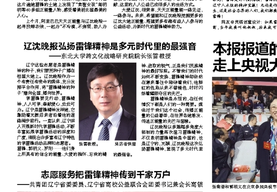 辽沈晚报以多篇幅多角度大部制的力量再次温习雷锋精神,不仅表明雷锋精神是中国的,也是辽宁的,无疑,辽沈晚报这次弘扬雷锋精神,显现了多元时代里的最强音。